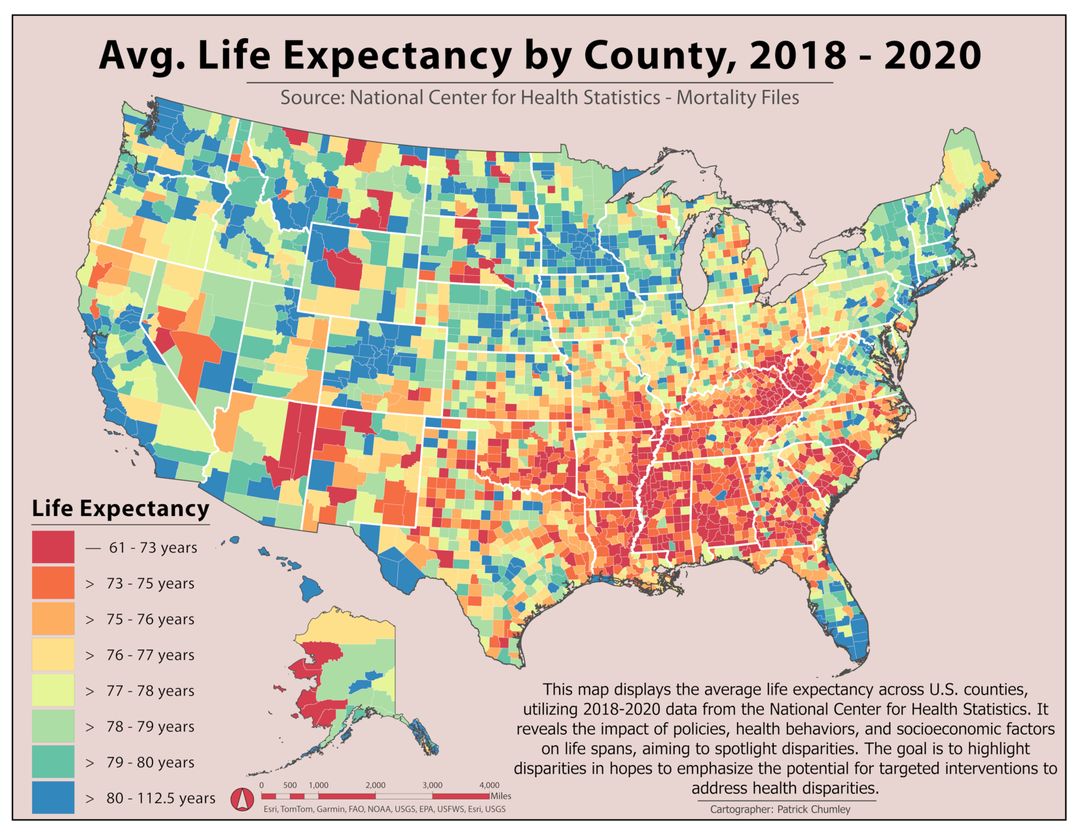 Ultimately, I decided to narrow the scope of this project to a dataset "National Center for Health Statistics Mortality files (2018-2020)" analyzing different factors on a county level instead. Leveraging SQL expressions and merging datasets from the US Census, USDA, and the National Center for Health Statistics, I created a comprehensive feature layer for this analysis. This layer facilitated spatial joins with the life expectancy and socioeconomic datasets, enabling in-depth examinations.