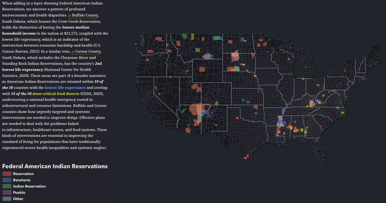 Through various layers, such as those highlighting extremes in life expectancy, income disparities, and food access, I crafted a detailed analysis showcased in an Arc StoryMap presentation.