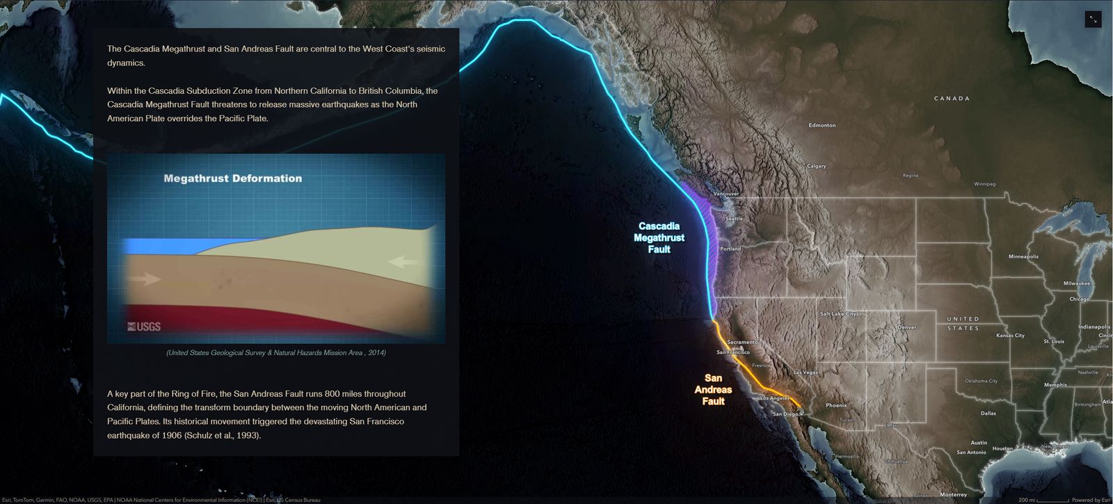 This ArcGIS StoryMap was created to explore the complexities of the West Coast's and the Pacific Northwest's seismic destiny in great detail. With a focus on earthquake forecasting, disaster preparedness, urban resilience issues, and the outlining of the Pacific Ring of Fire and Cascadia Subduction Zone, this exploration is broken up into multiple sections with the goal of illuminating the relationship between human civilization and the unyielding forces of nature.